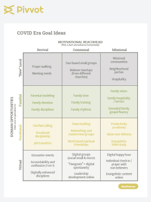 Considering all of the things that have changed in 2020, it’s easy to lose sight of the things that haven’t changed. In my first How to Set Church Goals During COVID post, I listed the top ten things that haven’t changed in this past year. I concluded that post with four steps to guide you in your setting goals for your church for 2021. In the fourth step, I introduced you to the COVID Era Goal Ideas tool that Dave Rhodes and I developed earlier this year. Now, I’d like to explore the potential power of this tool a bit further.