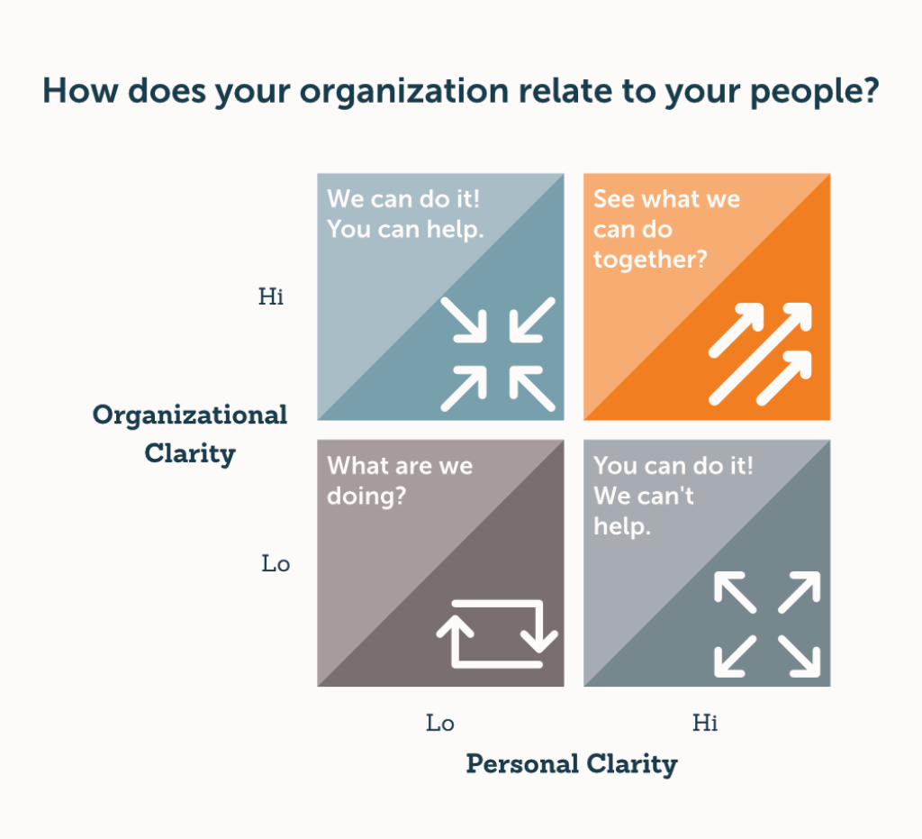 No matter what good things might be happening in the organization, when organizational clarity and personal clarity are both low, the organization has gotten stuck in "preservation mode." No organization starts out this way. There was always a fire, a zeal, a cause that people took a risk to make real. But it's common for organizations to become victims of their own success. With so much to keep track of and with so many people who joined for different reasons than those at the beginning, it becomes hard to remain clear on what the organization does and why and how it does it. Under these conditions, the unconscious, default vision for both the organization and its people is "keep what we like and get more of it." Together they spin in circles.