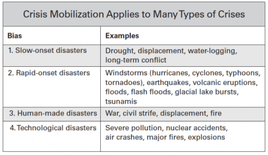 Tearfund’s book, Disasters and the Local Church, identifies four basic types of disasters. This list, shown below, builds an appreciation for the scope of crisis mobilization opportunities. In addition each kind of crisis provides many different opportunities for the role of a church including immediate response, resource provision, compassion and care, influencing and shaping values, acting as a community peacemaker, facilitating community action, and advocating for marginalized people.