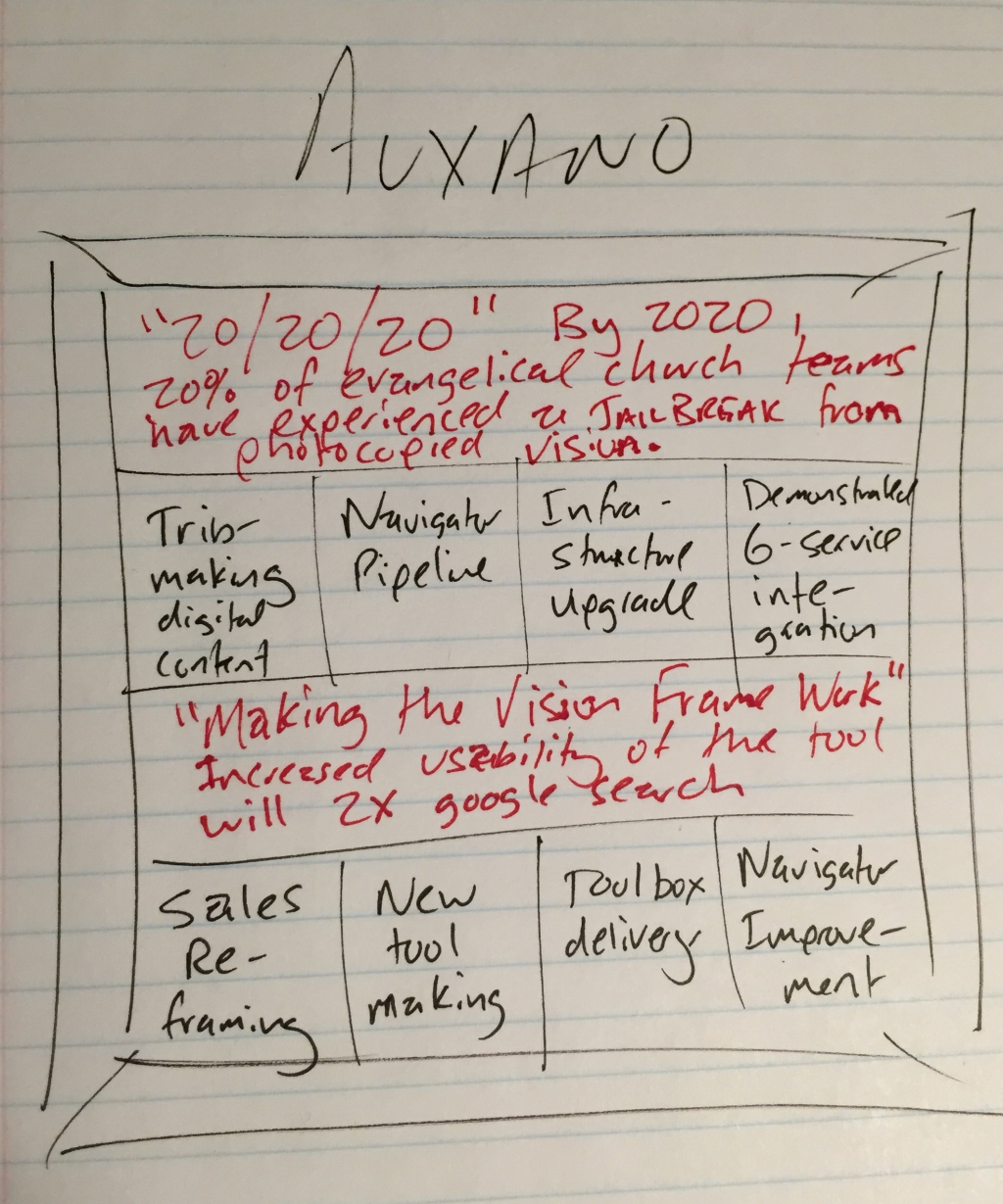 Here is an example of what a napkin sketch looks like. Keep in mind that there my be a lot of information behind the keyword in the napkin sketch. But the key practice is enthusiastically knowing and sharing the plan. Vision transfers through people not paper. This is the current Horizon Storyline we are running at Auxano, the nonprofit consulting group that I founded and lead. This is for our planning cycle that started in April of 2016. Our midground vision is "Making the Vision Frame Work" and we have four action initiative teams to execute our goal by October 2016.