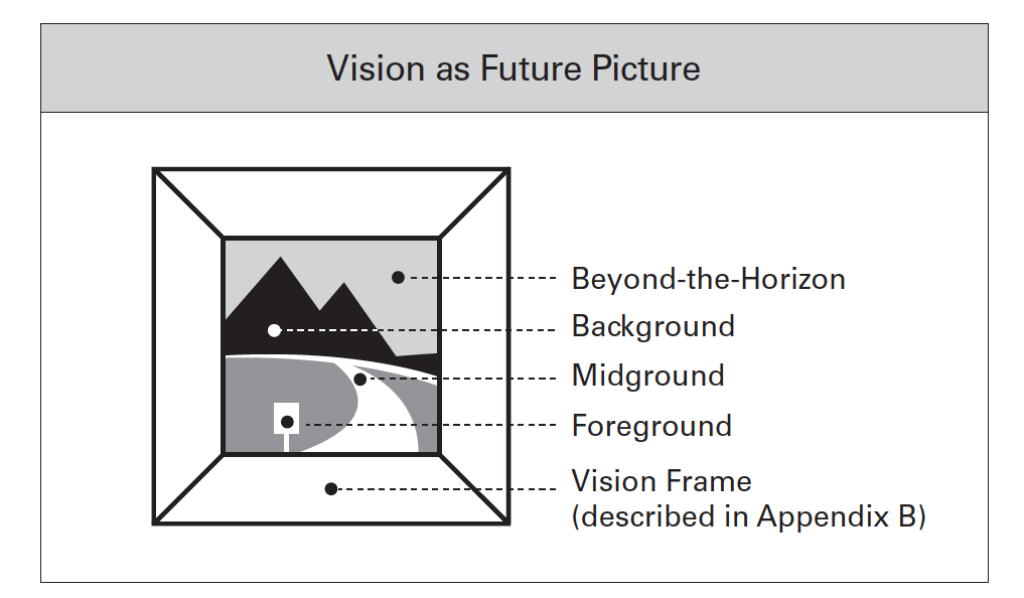In summary, the Beyond-The-Horizon is a simple picture idea that can be developed into a vivid description 5-20 years into the future depending on the age and life stage of the church. It represents the ministry's ultimate contribution communicated through a picture of the future; a destination in time. The background vision is the four most important strategic emphases in the next three years to achieve the long-range dream. The midground vision is the one most important goal in the church in the next year, determined in light of the long-range context. Finally, the "bottom four" foreground initiatives are 90-day horizon action steps to accomplish the one-year goal.