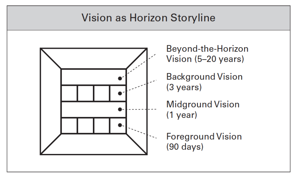 In a nutshell the Horizon Storyline is a tool to develop the right amount of vision content for the right time in the future, for the entire leadership team. It helps a church achieve all the merits of a vivid vision in a way the whole team engages. It does this by providing four time frames to plan around and by showing how many goals each time frame needs. Quickly you will begin to see how it solves virtually all of your vision and planning challenges.